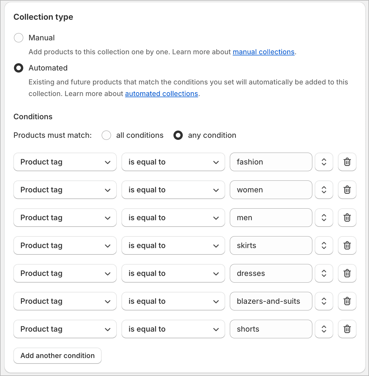 To simplify the process of product assignment, create a condition based on matching tags for each sub-category.